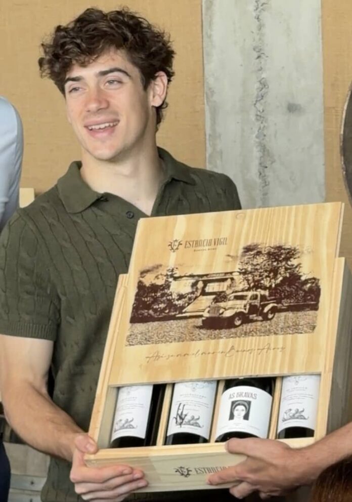 Uno de los momentos destacados llegó con los obsequios de Alejandro Vigil: un box con vinos de alta gama —incluyendo un Malbec de 100 puntos— y un botellón de seis litros de Malbec Argentino, que Colapinto levantó como si celebrara en un podio.