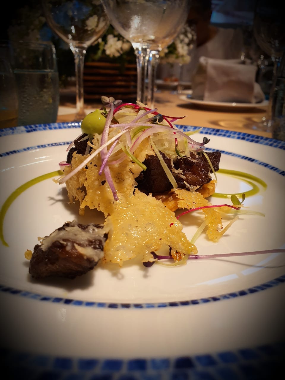 - Chicharrón de Rib Eye con crocante de queso parmesano.